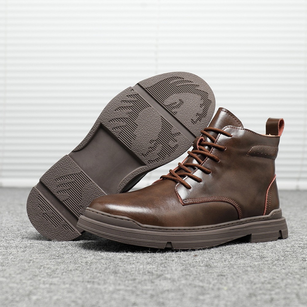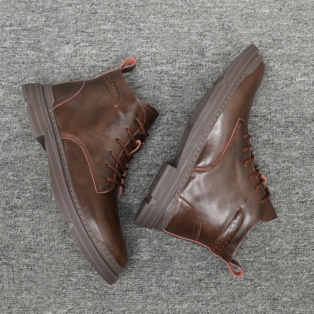 Men's Round Toe Casual Leather Boots Front Lace-Up Martin Boots Flat Heel